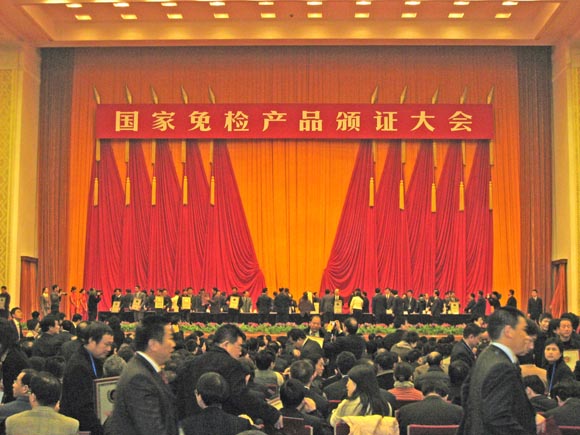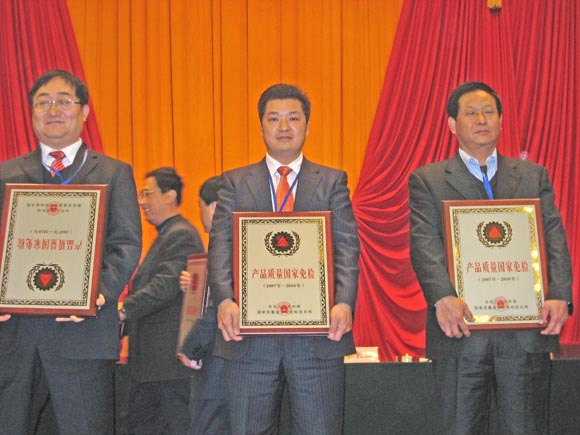 2007年12月14日,國(guó)家質(zhì)量監(jiān)督檢驗(yàn)檢疫總局,在北京人民大會(huì)堂隆重舉行了“國(guó)家免檢產(chǎn)品頒布大會(huì)”國(guó)家總局李長(zhǎng)江局長(zhǎng)親自為我司頒獎(jiǎng)。